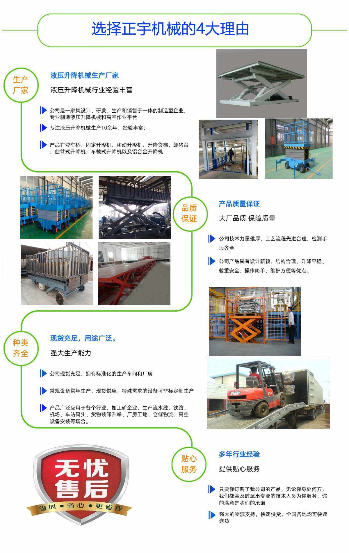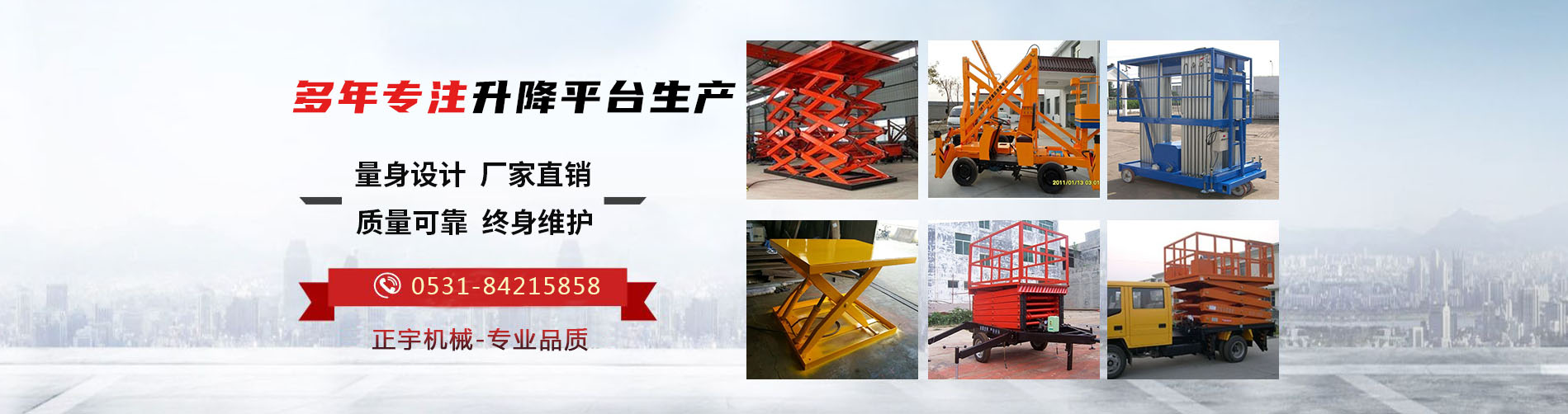 濟(jì)南正宇升降機(jī)械有限公司是一家集設(shè)計(jì)、研發(fā)、生產(chǎn)和銷售于一體的制造型企業(yè),生產(chǎn)液壓升降機(jī)械和高空作業(yè)平臺(tái),公司處于素有泉城美稱的山東省濟(jì)南市,坐落于濟(jì)北開發(fā)區(qū)。優(yōu)越的地理位置和便利的交通給公司的發(fā)展帶來(lái)了充分的條件。正宇液壓技術(shù)力量厚,工藝流程先進(jìn)合理,檢測(cè)手段齊全。目前主要產(chǎn)品有:高空作業(yè)平臺(tái)、登車橋、固定升降機(jī)、移動(dòng)升降機(jī)以及鋁合金升降機(jī)等等。公司產(chǎn)品具有設(shè)計(jì)新穎、結(jié)構(gòu)合理、升降平穩(wěn)、載重安全、操作簡(jiǎn)單、維護(hù)方便等優(yōu)點(diǎn)。產(chǎn)品廣泛應(yīng)用于各個(gè)行業(yè),如工礦企業(yè)、生產(chǎn)流水線、鐵路、機(jī)場(chǎng)、車站碼頭、貨物裝卸升舉、廠房工地、倉(cāng)儲(chǔ)物流、高空設(shè)備安裝等場(chǎng)合。公司以誠(chéng)信、創(chuàng)新、穩(wěn)健為宗旨,以品質(zhì)、完善服務(wù)的理念,迎接市場(chǎng)的挑戰(zhàn)。期待您的咨詢!